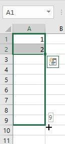 Pokud potřebujete do buněk vložit posloupnost čísel, např. do sloupce A čísla od 1 do 100, v žádném případě to nedělejte ručně. Stačí, když do prvních dvou buněk sloupce A napíšete první dvě hodnoty z této posloupnosti (1,2), označíte obě dvě buňky a pravý dolní roh tohoto označení chytíte levým tlačítkem myši a táhnete směrem dolů. Na požadovaném konci posloupnosti levé tlačítko myši pusťte. Kromě pořadových čísel lze také vytvářet např. seznam lichých nebo sudých čísel apod. Tento postup ale není vhodný pro složitější posloupnosti nebo posloupnosti vzorců.