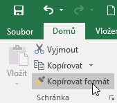 Pokud máte v Excelu vytvořenou tabulku, která je určitým způsobem naformátována a chcete tento formát použít i na jiném místě v sešitu, v jiné tabulce, slouží k tomu příkaz Kopírovat formát, který naleznete na kartě Domů ve skupině Schránka. Stačí, když označíte buňku, z níž se má formát zkopírovat, a klepnete na příkaz Kopírovat formát. Excel zkopíruje formát a vytvoří z kurzoru myši jakýsi štětec, kterým můžete přetřít jinou buňku nebo oblast tak, aby vypadala stejně, jako ta původní.