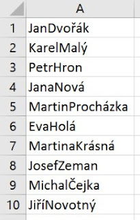 Představte si situaci, kdy máte v Excelu tabulku vyexportovanou z nějakého evidenčního systému a to ve tvaru, který není moc vhodný pro následné zpracování. Např., že máte v jednom sloupci jak jméno, tak příjmení evidované osoby. Ano, přes určité textové funkce by šlo takový text rozdělit do jednotlivých sloupců, ale právě proto je tu funkcionalita dynamického doplňování, které toto provede za vás. Taková tabulka by mohla vypadat tak, jak vidíte na následujícím obrázku.
