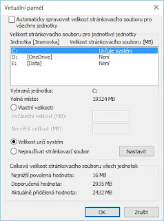 Virtuální paměť je speciální typ paměti, která vzniká a využívá se, pokud je operační paměť počítače již zcela zaplněna. Ve skutečnosti se jedná o stránkovací soubor s názvem pagefile.sys, který naleznete v kořenovém adresáři disku C. V případě potřeby tedy systém zapíše (odloží) část dat do stránkovacího souboru, aby uvolnil místo v operační paměti. Protože je však čtení a zápis na pevný disk několikanásobně pomalejší, než přímo z operační paměti, jedná se pouze o jakési řešení v nouzi. Proto je vždy vhodné mít dostatečnou kapacitu operační paměti. V dnešní době se stává standardem kapacita okolo 4 GB operační paměti. V případě zvažovaného rozšíření pozor na to, jakou edici systému (32 nebo 64bitovou) máte. Pouze 64 bitová dokáže využít 4GB a více. Dostatek operační paměti je velice důležitý také u notebooků, kde jsou pevné disky většinou pomalejší, než v klasických počítačích a pomalost stránkovacího souboru se zde projevuje ještě více. Velikost virtuální paměti můžete nastavit v Ovládacích panelech – Systém – Upřesnit nastavení systému – záložka Upřesnit – skupina Výkon – tlačítko Nastavení – záložka Upřesnit – tlačítko Změnit. Doporučení a rady, jaké jsou nejvhodnější hodnoty pro velikost virtuální paměti, jsou různorodé. Pro běžné použití doporučuji nechat systém, aby automaticky spravoval velikost virtuální paměti. V případě pomalého systému je totiž nejlepším řešením právě zvýšení velikosti operační paměti jako takové. Pokud máte v počítači 6-8 GB a více operační paměti, můžete zkusit vypnout virtuální paměť úplně. V tomto případě (pokud nepoužíváte programy velice náročné na operační paměť – 3D modelování apod.) by mělo být zrychlení systému znatelné, protože veškeré operace s daty budou probíhat pouze v rychlé operační paměti.