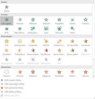 • Úvodní – efekty pro zobrazení objektů na snímku, tj. na snímku není vidět žádný objekt a má se efektním způsobem zobrazit;