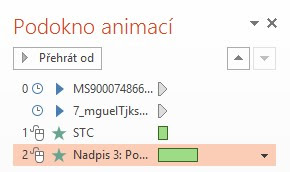 Pro správu animací v rámci snímku slouží tzv. Podokno animací. Po jeho aktivaci (karta Animace – skupina Rozšířené možnosti animací) se v pravé části aplikace PowerPoint zobrazí stejnojmenné okno, v němž je přehledně vidět, jaké je pořadí animací, délka trvání animace a pomocí ikonky je charakterizován i typ vybrané animace. Přes pravé tlačítko myši můžete pomocí kontextové nabídky na jednotlivých animacích provádět další úpravy, změny pořadí a detailnější nastavení.